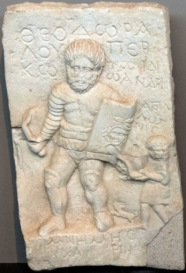 Estela funeraria con gladiador, 150 -200 d.C. Thessaloniki, Museo Arqueológico Nacional. El relieve muestra al fallecido Lupercus, ΛΟΥΡΕΡΚΩ. Probablemente era un "Thraex", un tipo de gladiador romano armado al estilo tracio. Parece estar a punto de comenzar una nueva pelea. Su cabello es muy voluminoso. Exhibe una barba corta y peluda. Lleva un "subligáculo" y un "balteus", una "manica" acolchada en el brazo derecho, y grebas. En su mano izquierda tiene un pequeño escudo rectangular curvado adornado con una cabeza de Medusa, y en la derecha, la "sica", daga característica de los Tracios. A su izquierda, un niño, quizás un sirviente, con su casco decorado con una cimera de grifo, completa la escena. El nombre del chico era Apollonis, ΑΠΟΛΛΟΝΙϹ, como dice la inscripción sobre su cabeza. Además, un perro casi en miniatura salta sobre la pierna izquierda de Lupercus.